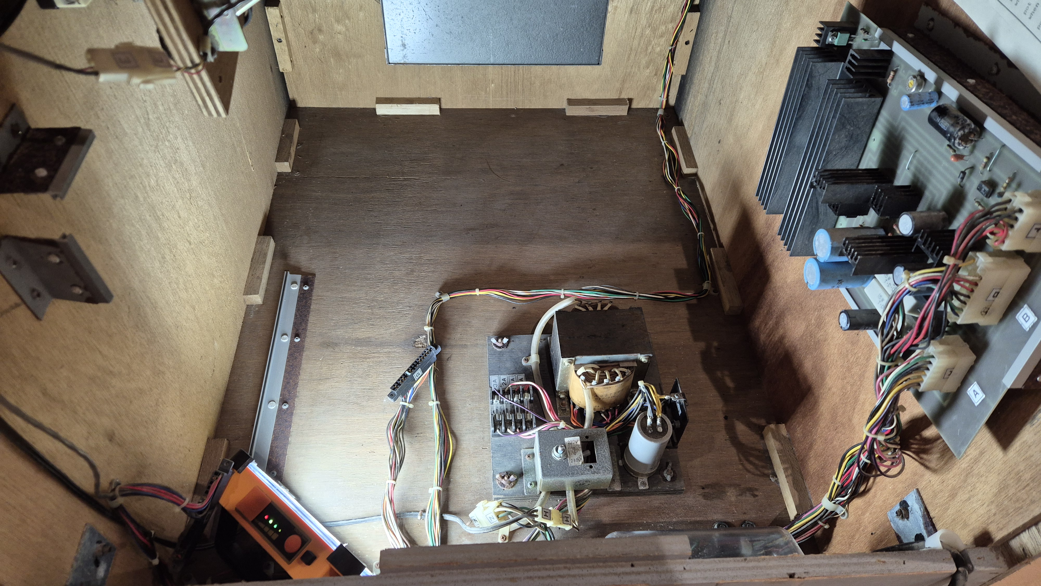 Então é hora de olhar para as entranhas do gabinete. Tudo está lá, exceto o cenário “espacial” de papelão. Uma substituição foi encomendada ao meu amigo Ollie em Oficina de Artes Arcade e deve estar aqui em alguns dias.