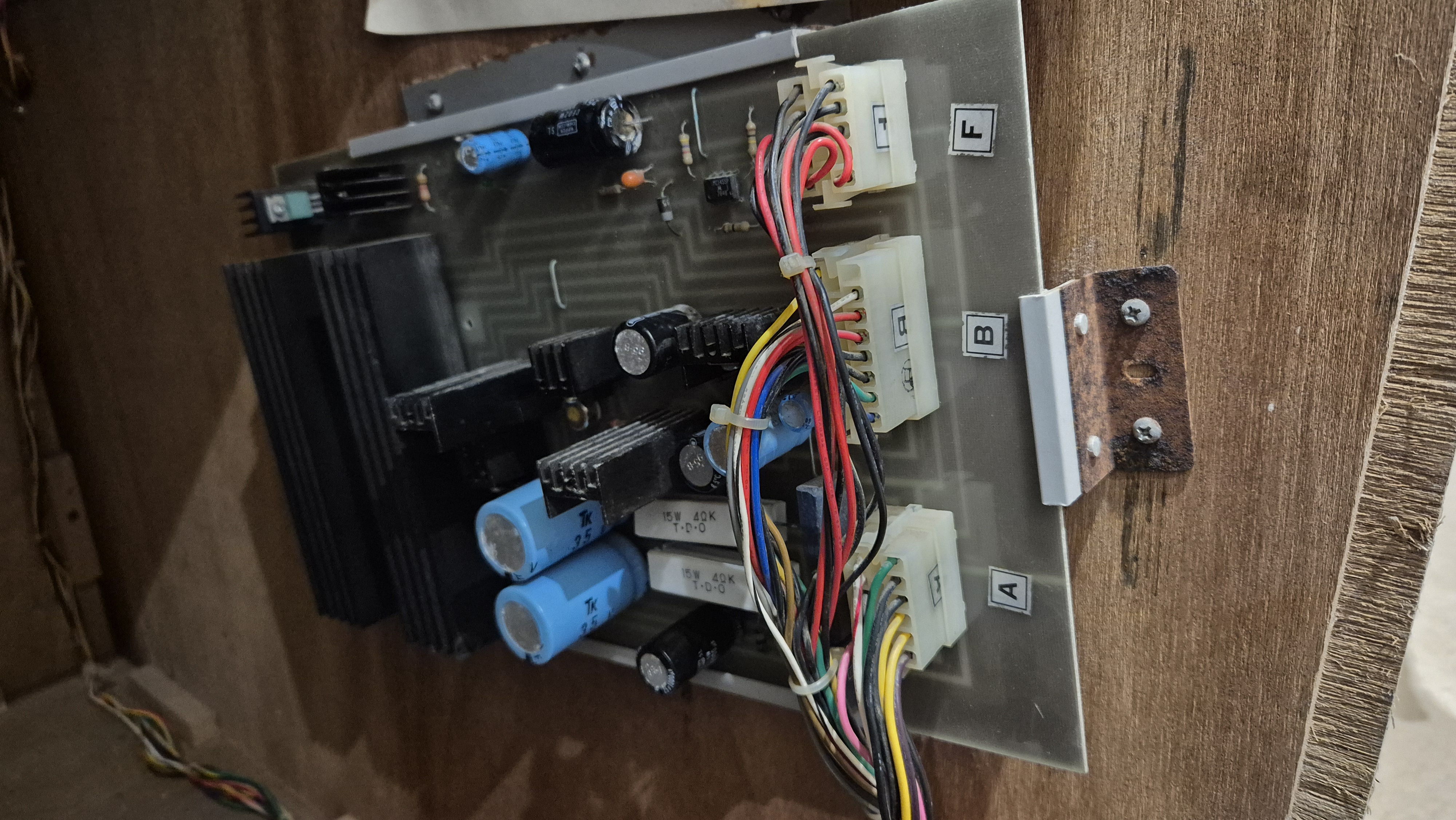 1 placa-mãe, 2 placas de som e placa de alimentação estão prontas. Muita coisa estava errada! A placa de alimentação tinha um capacitor em curto na fonte de 18 V e é por isso que os fusíveis estavam queimando. Todas as outras tensões testam ok, mas há um resistor que destaquei na placa que sugiro que você troque (está funcionando, mas parece quebradiço, mas não tenho nenhum). Você precisa de um 100 ohm 1/2 watt. A outra placa-mãe está com muita corrosão e não acho que valha a pena tentar consertar. Na verdade, eu não ficaria surpreso se as placas de trabalho desenvolvessem mais falhas no futuro. Eles ficaram encharcados por algumas horas e foram ligados/desligados algumas vezes e agora parecem estáveis.